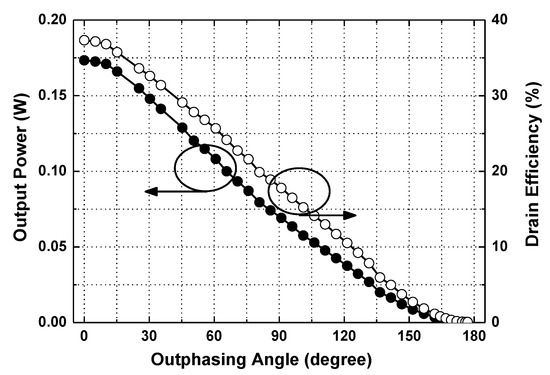 Figure 14 shows the measured output power and drain efficiency (DE) according to the outphasing angle variation at 1.7 GHz. A maximum DE of 37.3% was achieved with an output power of 173 mW (22.4 dBm) with VDD = 1.8 V and 2VDD = 3.6 V. The DE is defined as output power divided by DC power consumption of the final class-D PA stage. The measured DE versus output power is shown in Figure 15. The maximum power-added efficiency (PAE) was 26.5%, where the PAE is defined as output power divided by the DC power consumption of the final class-D PA stage and all inverter chains. The measured PAE is approximately 10% lower than DE in this work, but that is caused by the non-optimization of the two-stage inverter chain. In addition, the device size of the inverter chain using a 0.18 μm CMOS process will be larger than other works using a nanometer CMOS process, resulting in the large driving loss. If it is well-optimized further, and implemented using a nanometer CMOS process, PAE can be readily improved.