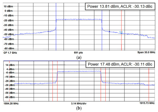 A modulated signal measurement was performed with a long-term evolution (LTE) signal with 10 MHz bandwidth, as shown in Figure 16. Without a digital pre-distortion (DPD) applied, the adjacent channel leakage ratio (ACLR) of the proposed outphasing PA was obtained at less than −30 dBc, up to 13.81 dBm, with a 2VDD of 3.6 V. Because the summation property can be obtained using the PCT outphasing combiner, the output signal was properly reconstructed. To check the capability of wide-frequency operation, the LTE signal was also tested at 1.9 GHz. By increasing the supply voltage, the linear output power could be increased. An ACLR of less than −30 dBc was obtained at up to 17.48 dBm, with 2VDD = 3.8 V at 1.9 GHz.