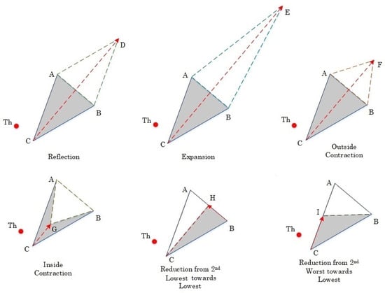 Figure 2. The basic operations of the HNM algorithm.A tetrahedron simplex is a geometrical object that has three vertices. Each vertex has n components, where n is the dimension of the mathematical problem. Since the HNM algorithm is employed to optimize three hyperparameters of SAE, n in our case equals to 3. Next, we sort the simplex vertices in descending order according to an error function that is defined later in the process to obtain four points associated with the lowest, second lowest, second highest, and highest values, such that . Note, each of have three axial components (dimensions). The HNM algorithm optimizes a single component in each iteration, while pursuing to explore the curvatures of the through six basic operations. - Step 2.