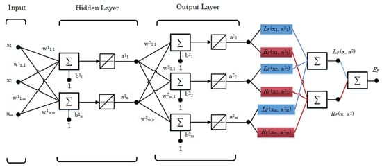 The only complication is that the for a multilayer SAE design is an indirect function of the weights and bias. Thus, the chain rule theory is required to calculate the partial derivatives of with respect to a third variable such as w or b in the hidden and output layers. By using the chain rule application, the derivatives of Equations (14) and (15) can be simplified to the following: