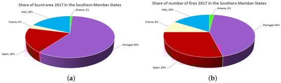 Share of the total burnt area (a) and the total number of fires (b) in each of the Southern Member States for 2017 [].
