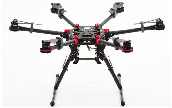 Different aspects were taken into account for the selection of the UAV, such as payload, energy consumption, maneuverability, and cost. For this work, a hexacopter structure was used, as shown in Figure 2, which provided more stability and robustness against meteorological conditions.