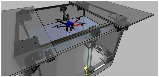 Therefore, taking into account the maximum dimensions of the UAV (1250 mm × 1250 mm × 730 mm) and the safety margins for operations, a base with dimensions of 2000 mm × 2000 mm × 1500 mm was constructed. After studying different designs, a base with an upper sliding door with a vertically moving bed that allowed performing the take-off and landing maneuvers was considered, as shown in Figure 5.
