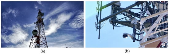 - Fire alert: The UAV in standby position receives an alert message with the position of the center of the fire in UTM coordinates. This alert is generated by a system composed of several thermal cameras (Figure 7b) installed at the top of a telecommunication tower, as shown in Figure 7a, which provides a vision of the environment in a short interval of time. This system is responsible for detecting fires within a radius of 3.5 km around the tower. In this phase, the software establishes the communication between the fire detection system and the UAV.