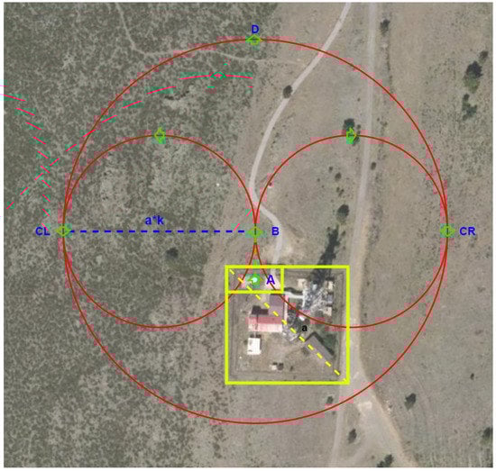 Figure 8. Safety take-off path [].Once the point or is reached, the algorithm generates the trajectory from this point to point D (the location of the center of the fire). - Generation of the path: After the take-off maneuver is accomplished, the algorithm generates a list of waypoints () based on several trajectories, as explained in Algorithm 1. These waypoints are in meters with respect to the initial position (location at takeoff).