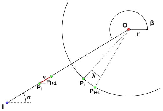 Figure 9. Generated trajectory.Then, the first path from the initial position to the orbit is calculated as follows:where is the linear distance between trajectory points and is between the center of the fire and the initial position, as shown in Figure 10.