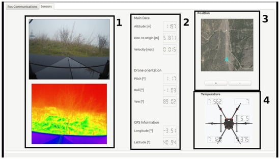 The designed GUI is divided into two tabs: a tab used to configure and establish communications between the ground station and the UAV onboard computer and a second tab showing the information captured by the sensors, as shown in Figure 11.