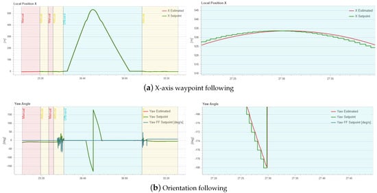Figure 14a,b shows how during the autonomous mode (off-board), the UAV was able to reach the appropriate orientation (red line) toward the points sent by the controller (green line), while flying at a speed of 22.7 km/h. These figures show how the UAV was able to follow the predefined waypoints, with a minimum error in position. Furthermore, it is important to mention that it would be necessary to adjust the PID gains so that the overall movement of the platform during the mission was fast and accurate.