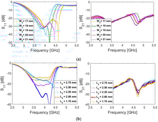 S11/S21 results of the diversity antenna for various values of (a) W2 and (b) L2.