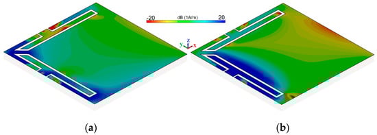 The current densities of the diversity antenna design from port 1 at (a) 3.8 and (b) 4.2 GHz.