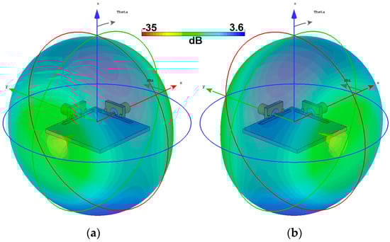 Figure 9 shows the S-parameters of the CPW-fed MIMO smartphone antenna. It can be observed from Figure 9a that all antenna elements exhibit good return loss results covering 3.4–4.4 GHz. It should also be noted that due to the effect of the MIMO configuration and also the big ground plane of the smartphone board, the lower operation frequency shifted from 3.2 to 3.4 GHz. However, it still covers the target 5G bands including 3.4–3.8 and 3.8–4.2 GHz. The isolations between ports are shown in Figure 9b. The maximum mutual couplings of the diversity antenna arrays are usually between the closely spaced diversity elements such as Ant. 1 and Ant. 2. Due, however, to similar performances and placements of the antenna pairs in the configuration of the proposed smartphone antenna, it is not necessary to show all S-parameters. As seen from Figure 9b, the isolation levels of the antenna ports are less than 16 dB within 3.4–4.4 GHz. This is mainly due to the strong mutual couplings between the adjacent ports. Figure 10 plots the radiation patterns at the middle frequency (4 GHz) of the first CPW-fed diversity antenna (with ports 1 and 2) mounted onto the smartphone PCB. As seen, the radiation patterns are symmetrical covering the top/bottom sides of the substrate and providing similar radiation behavior with gain vale of 4 dBi.