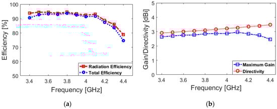 In order to have a better illumination about the working mechanism of the CPW-Fed, its simulated current distributions at 3.8 and 4.2 GHz are shown in Figure 3. As shown at 3.8 GHz, the current is mainly distributed near the arrow strip and outer boundary of the modified T-ring resonator, which verifies the role of the strip in creating a new resonance at 3.8 GHz. At 4.2 GHz, the currents are mainly concentrated inside of the modified T-ring slot [,]. The radiation patterns of the diversity antenna for each exciting port at 4 GHz (center frequency of the antenna operation band) are plotted in Figure 4. It is shown that well-defined polarization and pattern diversity is obtained for the antenna. The radiation patterns of the antenna are symmetrical, covering the top/bottom sides of the substrate and providing similar radiation behavior with a gain value of 3.6 dB. The fundamental radiation characteristics of the diversity antenna are also given in Figure 5 within the range of 3.4–4.4 GHz (with 0.1 GHz/step). As illustrated in Figure 5, the antenna exhibits high efficiencies over its 1 GHz impedance bandwidth. In addition, the antenna offers sufficient gain and directivity in the range of 3.4–4.4 GHz.