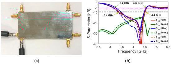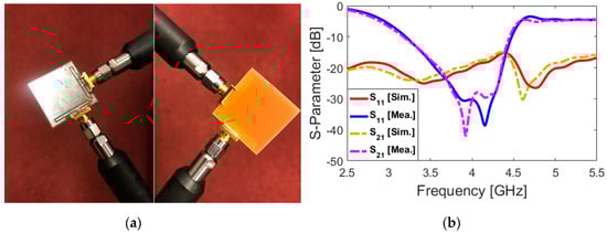 (a) Fabricated antenna’s top/bottom sides and (b) the simulated/measured S-parameters.