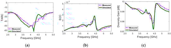 Figure 7 represents the calculated TARC, ECC and DG characteristics for the proposed dual-port diversity antenna. As shown in Figure 7a,b, the TARC and ECC results of this diversity antenna are very low within the band, which means the antenna is competent for diversity reception/transmission in the MIMO channels []. In addition, as can be observed from Figure 7c, the DG function of the design is greater than 9.97 dB over the entire band.