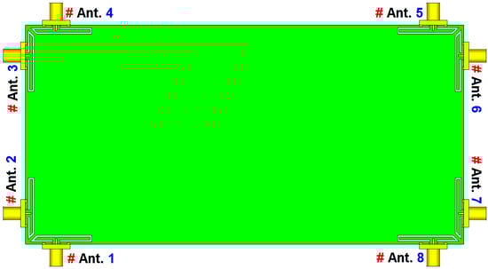 Four pairs of the modified CPW-fed diversity antenna mentioned above were placed in different corners of the smartphone board to form an eight-port MIMO antenna with a standard size of 150 × 75 × 1.6 mm3. Its structure is shown in Figure 8. As can be observed, due to the compact size and also the placement of the CPW-fed ring antenna, the proposed MIMO design occupies a very small part of the board.