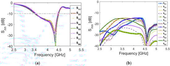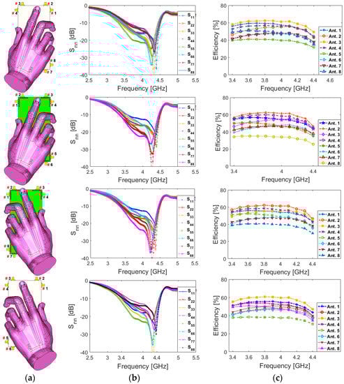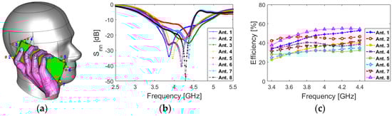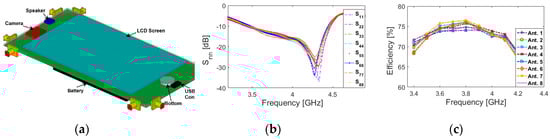 The Snn (S11~S88) and efficiency characteristics of the CPW-fed MIMO smartphone antenna in the presence of battery, speaker, camera, USB connector and LCD screen are investigated and illustrated in Figure 20. It was found that the designed CPW-fed MIMO antenna provides sufficient Snn and efficiencies supporting a 3.4–4.4 GHz band. In addition, as shown in Figure 20c, the array exhibits high efficiencies in the presence of smartphone components.