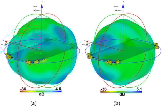 Radiation patterns of the dual-port diversity resonator from (a) port 1 and (b) port 2.