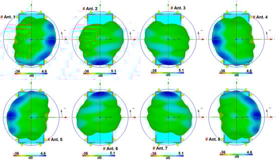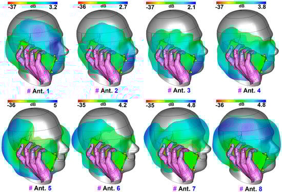 Compared with Figure 8, the maximum reduction of antenna gain is observed for the elements closely spaced with the user’s head and hand. In general, the closer the distance between the antenna element and the user’s hand/head is, the greater the reduction on the gain and the efficiencies []. As can be observed, the maximum reductions of the gain levels are discovered for the elements that are located near to the head phantom (Ant. 3). In addition, due to the presence of the head and hand phantoms, the radiation patterns are a bit distorted and become weaker. One can see that antenna elements are touched by different parts of the hand and head phantoms in the presented talk-mode.
