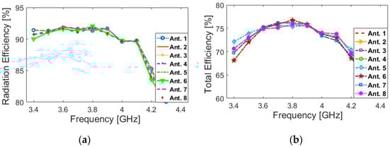 (a) Radiation and (b) total efficiencies of the antenna elements (Ant. 1–Ant. 8).