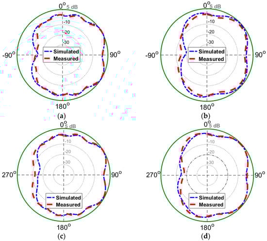 Measured and simulated radiation patterns are shown in Figure 15. When measuring radiation patterns, we keep one port excited and another one loaded with a 50-Ω load. In the measurement of radiation patterns, the smartphone MIMO antenna is used as the receiver, and a horn antenna is used as the transmitter. As can be observed from Figure 15 a,b, the sample smartphone antenna prototype offers good quasi-omnidirectional radiation patterns with an acceptable agreement between simulations and measurements [,,].