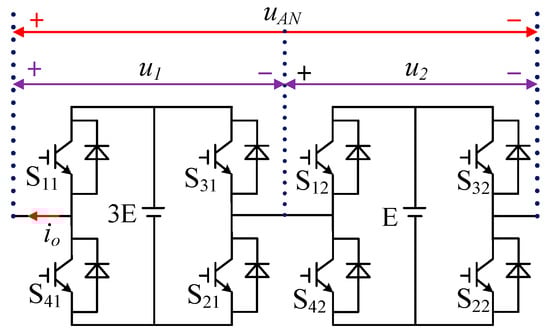 The phase A structure of the Type-III ACHB inverter is shown in Figure 1. The topology is formed by cascading two H-bridge units having a DC-side voltage ratio of 3:1, and S11, S21, S31, S41, S12, S22, S32, and S42 represent the respective switching devices. The DC side voltages of the two H-bridge units H1 and H2 are 3E and E, respectively. The output voltages of the two units are defined as uH1 and uH2, the output phase voltage is uAN, the output phase voltage fundamental amplitude is uAN(1), and the output phase current is io.
