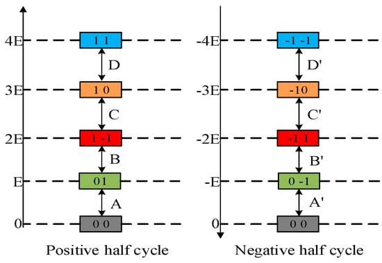 The state of the cascade inverter and the output level of each unit is represented by (S1, S2). The output level of each unit is as shown in Equation (2), and the total output level of the cascade inverter is as shown in Equation (3). Table 1 shows the operating status of the ACHB inverter. As it can be seen from the synthesis method of PWM levels in each interval in Figure 2, that when different PWM synthesis methods are selected, the output waveforms of different PWM levels will be corresponding, so that the output voltage waveforms of all levels of each cascade units are different. In the following, the positive half cycle is taken as an example to elaborate the synthesis method of the PWM level in each interval.