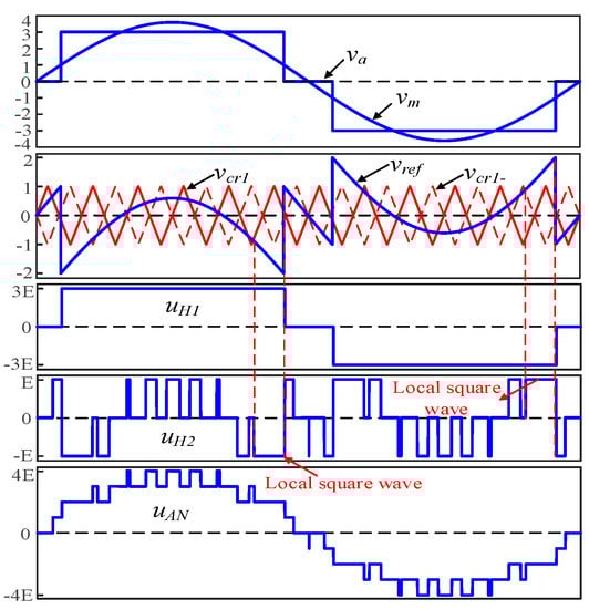 Figure 3 shows the principle of the HF-PWM modulation strategy. First, a square wave signal va is defined that is obtained by mutually modulating the modulated wave vm of the high-voltage unit and ±1. The drive pulse signal of each switch of the H1 unit can be obtained by using va. Then, by using the modulation wave vm of the high-voltage unit minus va, the modulation signal vref of the low-voltage unit is obtained. Finally, the vref and the triangular carriers vcr1 and vcr1- are modulated, and the driving pulse signals of the respective switching tubes of the low-voltage unit H2 can be obtained.