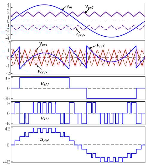 Against the problems of the above hybrid frequency modulation strategy, a modified hybrid frequency modulation (MHF-PWM) strategy is proposed in this paper. The modulation principle is shown in Figure 4. The high-voltage unit performs sinusoidal pulse width modulation (SPWM) by using a sine wave vm and a pair of positive and negative inversion carriers vcr2 and vcr2−, thereby obtaining driving logic signals of the switching tubes of the high-voltage unit. The low-voltage unit adopts a single-pole frequency-doubled SPWM modulation method, and performs a logic operation on the modulated wave vref and the carriers vcr1 and vcr1 to obtain driving pulse signals of the switching tubes of the low-voltage unit. Among them, the amplitude of carrier vcr1 and vcr1− is E, the frequency is 1/2 of vcr2, and the phase difference is 180°. Since vcr1 and vcr1− have the characteristics of carrier phase shifting, H2 can output high frequency PWM waveforms at a lower switching frequency.