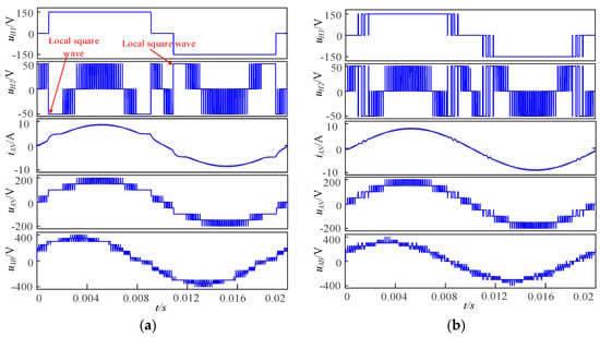 The simulation waveform of output voltage and current under the control of traditional HF-PWM and MHF-PWM is shown in Figure 5. As can be seen from Figure 5a, when the traditional HF-PWM strategy was used, an overshoot phenomenon in which the amplitude of the modulation wave vref exceeded the amplitude of the triangular carrier wave occurred in some intervals. Therefore, it was clearly seen that the output voltage uH2 of the low-voltage unit corresponding to the over-modulated region output was not a PWM wave, but a local square wave. The area corresponding to the output phase voltage uAN of the inverter can only be a square wave waveform; this results in a substantial increase in the low frequency sub-harmonic content in the phase voltage waveform. It can be seen from Figure 5b, that under the MHF-PWM control, there was no area for outputting a square wave waveform in the whole cycle, which solved the problem of the local square wave of the output voltage. Therefore, the low-frequency sub-harmonic content of the phase voltage was much smaller than that of the HF-PWM control and the waveform quality was better. As can be seen in Figure 5a,b, both the low-voltage H2 unit and the high-voltage H1 unit had the phenomenon of opposite polarity of output voltage, so the two modulation strategies had the problem of current backflow, which was determined by the inherent disadvantages of the topology of the Type-III ACHB inverter.