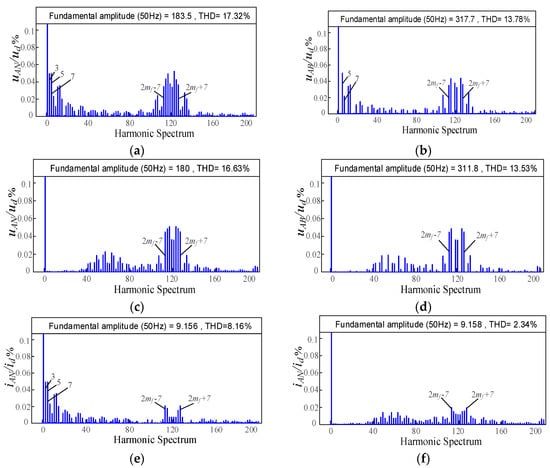 The spectrum of output phase voltage, phase current and line voltage of the HF-PWM and MHF-PWM strategies proposed in this paper are shown in Figure 6. It can be seen from Figure 6a,b,e, that under HF-PWM strategy, the harmonic components of phase voltage uAN and phase current iAN were mainly concentrated near 2mf, such as 2mf ± 3, 2mf ± 7, etc., among which the amplitude of the 3rd, 5th, and 7th harmonics was higher. The Total Harmonic Distortion (THD) of uAN was 17.32%, the THD of iAN was 8.16%. Because of the three-phase symmetrical load, the waveform of uAB had no 3th harmonic, but its 5th and 7th harmonic amplitude was still large, the THD of uAB was 13.78%. It can be seen from Figure 6c,d,f, that under the MHF-PWM strategy, the spectrum of the uAN and uAB voltage waveforms was also mainly distributed around 2mf, but the low-frequency sub-harmonics such as the 3rd, 5th, and 7th harmonics were basically eliminated. The THD contents of uAN and uAB were 16.63% and 13.53%, respectively, and the THD of iAN was 2.34%. Therefore, the MHF-PWM strategy proposed in this paper can eliminate the low-frequency sub-harmonics in the output voltage waveform of the Type-III ACHB nine-level inverter, which greatly improves the quality of the inverter output voltage waveform.