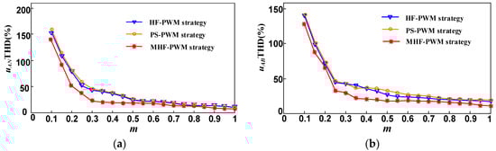 Figure 7a,b are the corresponding curves of THD and modulation degree m of output phase voltage uAN and output line voltage uAB under three modulation strategies, respectively. When the three control strategies simultaneously output the voltage waveform of the nine-level inverter, the THD value of the output voltage under the HF-PWM strategy and the PS-PWM strategy was almost identical throughout the modulation period, and was higher than the THD value of the output voltage under the MHF-PWM strategy. Therefore, as shown in Figure 7, the MHF-PWM strategy proposed in this paper can eliminate the low-frequency sub-harmonics in the output voltage waveform of the Type-III ACHB nine-level inverter, thereby improving the spectral characteristics of the inverter output voltage waveform and reducing the amplitude of THD.