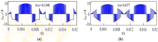 Figure 8 shows the DC-side current waveform of the low-voltage H2 unit under HF-PWM and MHF-PWM strategy control, respectively. It can be seen that due to the inherent disadvantages of the topology of the Type-III ACHB inverter, inevitably, the phenomenon of high-pressure H1 energy pouring into the low-pressure H2 unit occurred, although both of these modulation strategies had problems in which high-voltage units injected energy into the low-voltage unit and generated current backflow and power backflow. However, it can be clearly seen from the figure that the average current under MHF-PWM control was much larger than that of HF-PWM. This shows that, compared with the HF-PWM strategy control, the high-voltage H1 unit under the MHF-PWM strategy had less energy to inject into the low-voltage H2 unit. Therefore, it can be proved that the MHF-PWM strategy can reduce the degree of current backflow, thereby reducing the imbalance of the output power of the high-voltage H1 unit and the low-voltage H2 unit.