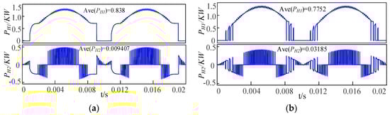 Figure 9 shows the waveforms of the instantaneous power output of each cascade unit under HF-PWM and MHF-PWM strategy control. It can be seen from the figure that in order to obtain the nine-level phase voltage output waveform of the Type-III ACHB inverter, the low-voltage unit needed to bear the energy from many high-voltage units in a specific area. Compared with the average power of the low-voltage unit under the HF-PWM strategy, under the control of MHF-PWM strategy, the energy accumulation of the low-voltage unit was small, which effectively inhibited the energy accumulation of the high-voltage unit to the low-voltage unit, and greatly reduced the degree of current backflow.