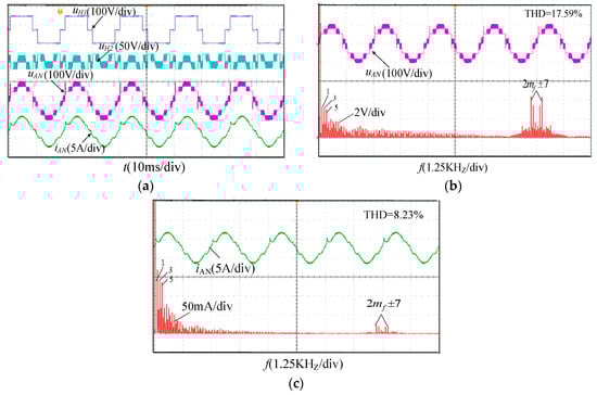 Figure 11 shows the experimental results of the ACHB nine-level inverter under the traditional hybrid modulation strategy. Figure 11a shows the output waveforms of the two-unit output voltages uH1 and uH2 and the phase voltage uAN, uH1 is a staircase wave and uH2 is a high-frequency PWM wave. When uAN is in [25V, 50V] and [−50 V, −25V], continuous PWM wave output cannot be achieved due to overshoot problem; Figure 11b,c are harmonic spectrum diagrams of the output phase voltage uAN and the phase current iAN, respectively. It can be seen from the figure that the harmonics of uAN and iAN were mainly 2mf ± 7th harmonics, and a large number of low-frequency harmonics such as 3th, 5th, and 7th, and the THD values of uAN and iAN were 17.59% and 8.23% respectively.