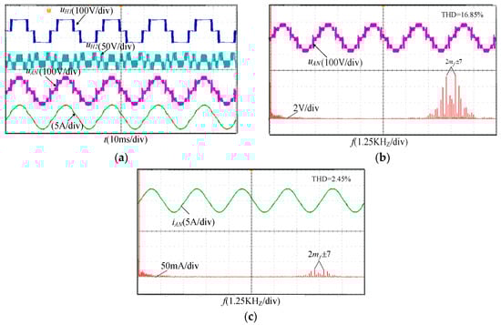 Figure 12 shows the experimental results of the ACHB inverter under the MHF-PWM strategy. Figure 12a shows the output waveforms of the two-unit output voltages uH1 and uH2 and the phase voltage uAN, uH1 and uH2 are high frequency PWM waves. This strategy solved the problem of local square wave when phase voltage uAN was in [25 V, 50 V] and [−50 V, −25 V], and realized the continuous PWM wave output of output voltage. Figure 12b,c are harmonic spectrum diagrams of the output phase voltage uAN and the phase current iAN, respectively. It can be seen from the figure that although the harmonics of uAN and iAN mainly contained the 2mf ± 7th harmonic, however, their 3th, 5th, 7th, and other low frequency harmonics were substantially eliminated. The THD values of uAN and iAN were 16.85% and 2.45%, respectively. Compared with the results of the THD values of uAN and iAN of 17.59% and 8.23% under the HF-PWM strategy, the THD of uAN and iAN under the MHF-PWM strategy was lower than that of the traditional HF-PWM, thus improving the quality of the inverter output voltage waveform.