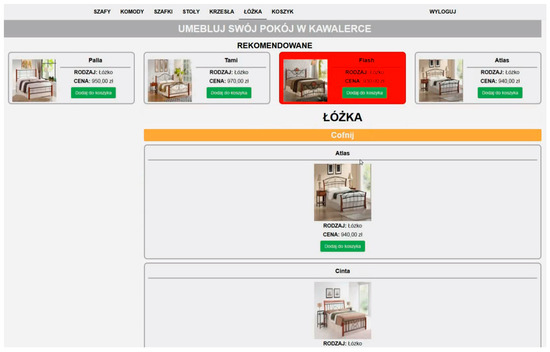 It was ensured that product features, i.e., name, image and price, would not stand out from other products in the category. It was assumed that the possible distinction of a particular RCi location would be achieved only by means of visual intensity VI. Three levels of intensity were used: standard (without any highlight)—VI1, flickering (slowly disappears and reappears every 1–2 s)—VI2 and background in red—VI3. There was a maximum of one RCi at VI2 or VI3 for each product category. An example of visual intensity of the last kind (VI3) is shown in Figure 3.