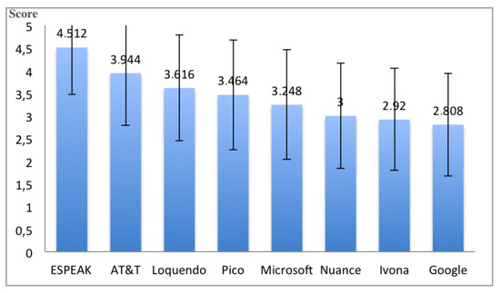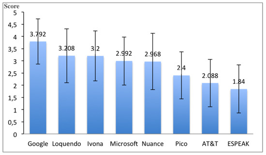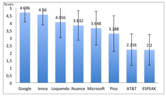 According to the results obtained for Maggie—Wilks’ Lambda = , —there are significant differences between the TTS systems. For this reason, we can say that not all the TTS systems are equally suitable for Maggie. Table 1 shows the descriptive statistics and Figure A4 presents the pairwise comparison table. In this figure, it can be observed that the most suitable one is Google although Ivona, Loquendo, and Nuance obtain similar results, . On the other hand, the worst evaluated TTS systems, being significantly different from Google (), are Espeak and Pico (see Figure 7).