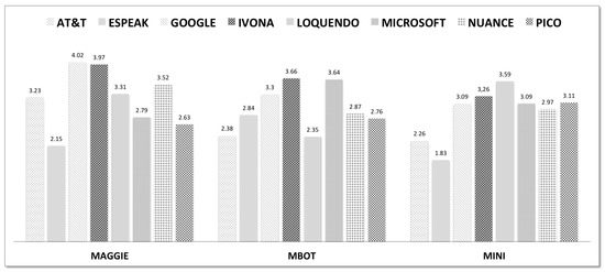 In relation to RQ4, we observe that, although for each robot there are significant differences between the TTS systems, we cannot conclude that there is just one most suitable TTS system for each robot. In fact, there is a set of TTS systems preferred for each robot—for Maggie: Google, Ivona, Nuance, and Loquendo; for Mbot: Ivona, Microsoft, and Google; for Mini: Loquendo, Ivona, Pico, Google, Microsoft, and Nuance.