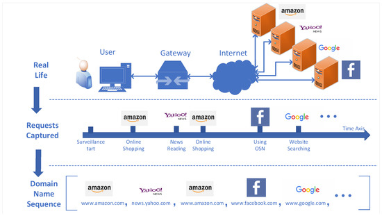 Internet user behavior [2,6,7,8,9,10,11,12] has long been talked about and researched. Major aspects of this area include behavior modeling in the cloud [7,8], in online social networks (OSNs) [9,10], in network traffic [2,6] and so forth. Ning Xia [2] developed an integrated framework to quantify user behaviors, which leverages information from both OSN pages and traffic. Besides, in this paper the author has proven that information extracted from traffic is more detailed and dynamic than that drawn from static web pages.