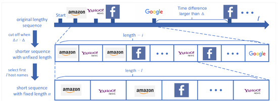 After the filtering, the de-noised sequence is still too lengthy, and we expect to break it down to temporally finer grained small sequences, as is stated above. To do so, a threshold-based segmentation scheme is applied to the lengthy sequence. Giving a timeout threshold , if the capture time interval between two consecutive host names exceeds the threshold, the sequence will be cut between these two host names, and thus two shorter sequences are generated, as is illustrated in Figure 3. The last operation in reshaping is to convert the input sequences into the same length. Sequences that are too long are chopped off from the tail and sequences too short are discarded, as is shown in Figure 3.