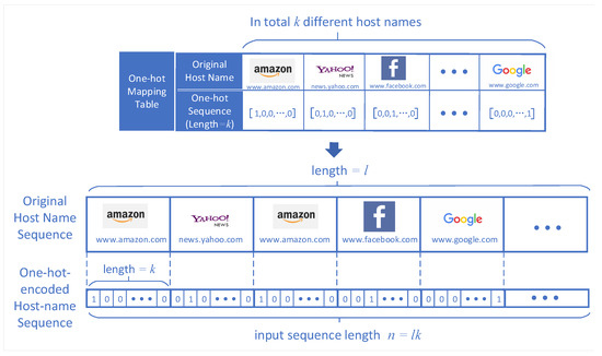 The one-hot encoding process from the original host name sequence to the one-hot-encoded sparse sequence.
