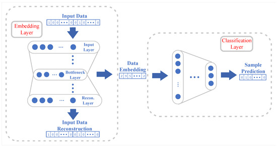 The second module of the structure is the classification layer. After obtaining the sample embeddings from the previous layer, a fully-connected net takes the embeddings as input, and it generates the final predictions of the sample as output. A softmax layer is appended to the hidden layers of the fully-connected net to fulfill the prediction. Although the neural net in the classification layer is simple in structure, it is necessary, since in our design the embedding layer is not supposed to generate the prediction labels directly. The major reason is that an autoencoder is a dimensionality reducer rather than a predictor, since its primary goal is to retain the most informative data for input reconstruction. Notwithstanding, the fact that whether this data is useful or not for prediction is not within the concern of an autoencoder. Thus, a classification layer is needed to convert the embedding to the predicted label, which results in the current architecture of Argus.