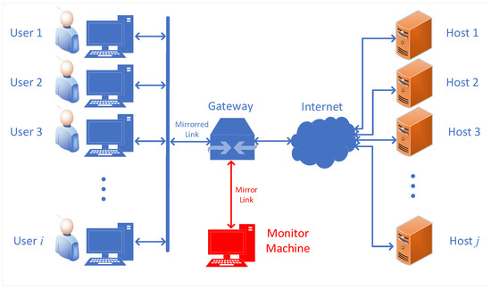 The dataset we use for the experiment was captured from the gateway router located at the Laboratory of Complex and Multi-dimensional Signal Processing in University of Electronic Science and Technology of China. There were 60 users doing their daily jobs inside the network, and during the surveillance their devices were kept unchanged. The surveillance continued for over two months, and the overall captured traffic volume exceeded two terabytes. Figure 6 logically exemplifies the environment of the traffic capture.