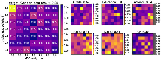 Argus might require different weight settings for best accuracies across different prediction targets, according to Figure 7. We can see that for the gender prediction (shown in the largest heatmap in Figure 7), the increase of weights introduced an ascending tendency in accuracy, where the larger the and , the higher the accuracy in most cases. However this proportionality does not hold for all the prediction targets. For the D.o.B. (as well as P.o.B.) prediction, the results may fluctuate across the search space. For the R.F. prediction, MSE and triplet loss require relatively small weights to achieve a high accuracy. In other cases, such as the prediction of education, the triplet loss shows no obvious impact on the accuracy as continues to increase, while for higher there is a trend for higher accuracy.
