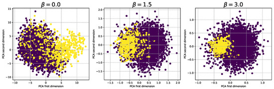 The scatter plot of the training samples on the space of principal component analysis (PCA) components. The horizontal axis refers to the largest principal component of the corresponding embeddings of the training samples, and the vertical axis refers to the second largest principal component. The yellow spots in the plot represent the male users, and the dark purple spots represent the female users. Three sub-figures share the same parameter settings except the values of .
