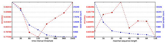 From Figure 9 we can see that, as the rotation parameters increase, both sample count curves decrease as expected. Nonetheless, the accuracy curves exhibit different patterns in two plots: the accuracy for the time interval threshold decreases at first yet starts to increase after a certain value is exceeded, while for the maximal sequence length the accuracy curve has an ascending-to-almost- descending pattern. However we argue that the cause for such patterns may be introduced by the change of input data conditions across each rotation, where the input data changes because the split sample is different from the previous, making a comparison between different rotations.