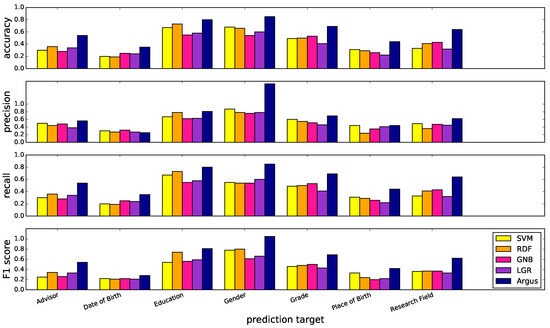 In this subsection we compare Argus between different methods, which include SVM, RDF, GNB and LGR. The metrics for use are accuracy, precision, recall and F1 score, and the prediction targets are listed in Table 1. The results are shown in Figure 10.