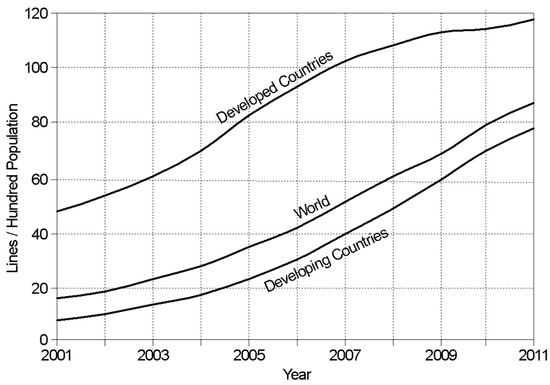 Cellular penetration showing the dramatic increase in developing countries over the last decade, adapted from [5].