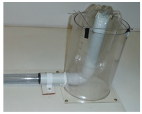 Rather than using one of the conventional calibration methods such as a calibrated syringe [38,39] or a Pulmonary Waveform Generator [19], a technique that could easily be used in the developing world was applied. This involved measuring the total flow volume and comparing that to the volume obtained by integrating the flow rate (from the Fleisch cell) during the same period. To measure the volume, a simple spirometer [40] was constructed using a cylindrical container, some sections of solid PVC pipe and the graduated base of a soft-drink bottle as shown in Figure 5.