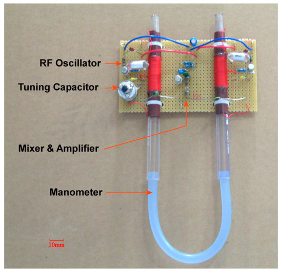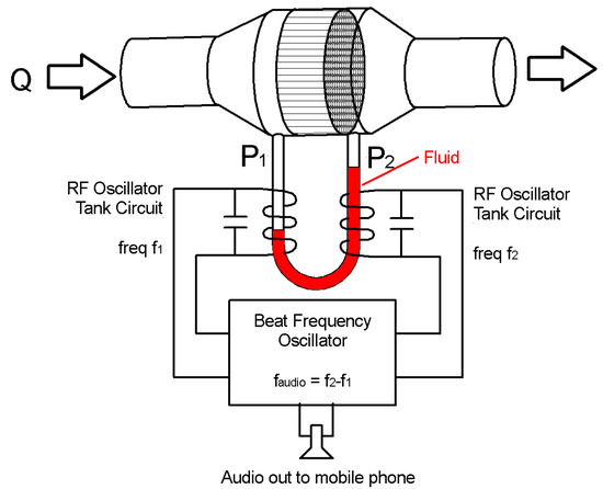 An alternative that relies on the relative permeability and permittivity of water (which are relatively insensitive to contamination [43]) would be to configure each of the arms of the manometer as the “inductive” component of a pair of transistor-based radio frequency oscillators, as shown in Figure 6. In theory, as the water level at the core of each coil changes, the permeability will change slightly, which will increase the frequency of one oscillator and decrease the frequency of the other. The beat frequency, produced by mixing the two radio frequency (RF) signals is maintained within the audio range [44] and will be indicative of the differential pressure.